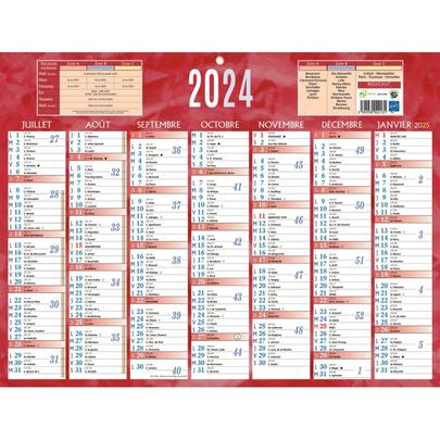 Calendrier semestriel 32 x 42 cm rouge. Format : 32 x 42 cm. 7 mois sur chaque face. Impression des congés scolaires ainsi que de la numérotation des semaines. Un œillet en métal. Lunaisons.