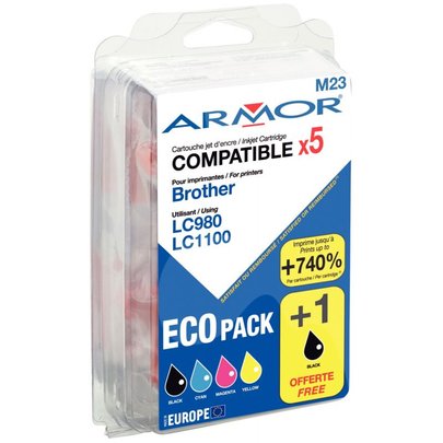 Pack de 5 cartouches encre compatible à la marque Brother LC980/1100 noir cyan magenta et jaune + 1 noir offert