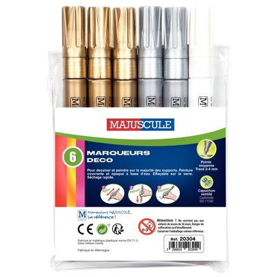 Pochette de 6 marqueurs peinture pointe moyenne or, argent et blanc. Pointe moyenne à valve. A base d'eau. Peinture lumineuse et couvrante. Séchage rapide. Adaptés aux matériaux, tels que terre cuite, bois, verre,carton, plâtre, pâte à modeler, métal.