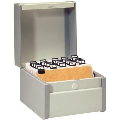 Boîte à fiches Provence format 210x148mm A5 paysage. En plastique rigide et cadre métallique. Coloris gris nuée. Peut contenir jusqu'à 500 fiches. Livrée avec un séparateur métallique réglable tous les 17mm.