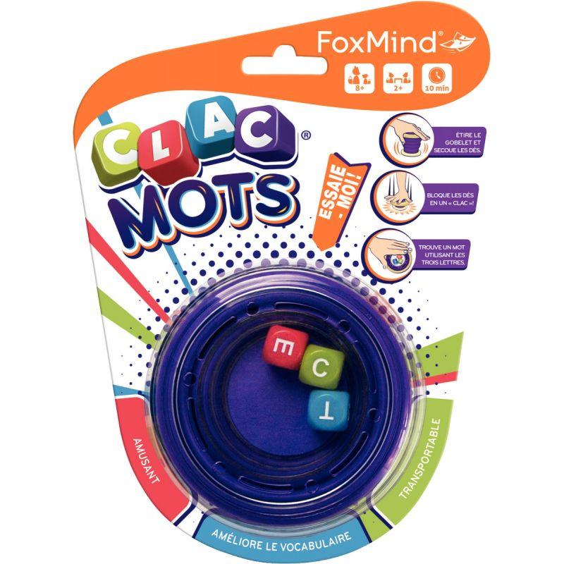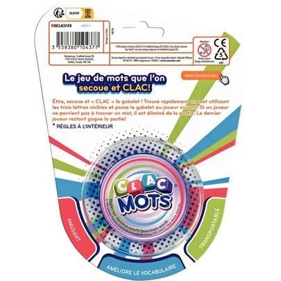 Clac mots. Contenu : 1 shaker en silicone et 3 dés de couleur But du jeu : Trouver un mot (en 5 secondes) en incluant les 3 lettres définit par le shaker. Les joueurs décident d’un nombre de vie entre 2 et 5. A tour de rôle, ils énoncent 1 mot comprenant les 3 lettres du shaker. Le tour s’arrête quand un joueur est incapable de trouver un mot. Le dernier joueur à posséder au moins une vie gagne la partie. Intérêt pédagogique : jeu de rapidité, améliore le vocabulaire. A partir de 8 ans 2 joueurs et plus Durée de la partie : environ 10 minutes |