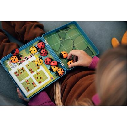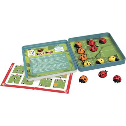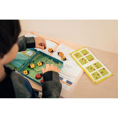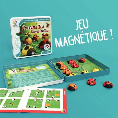 Coccinelles demoiselles. Contenu : 1 boîte de jeu métallique qui sert aussi pour le rangement, 12 coccinelles aimantées (5 rouges, 4 oranges, 3 jaunes), 1 livret de 48 défis avec leur solution. But du jeu : jeu magnétique de déduction dans lequel vous devrez trouver où poser vos coccinelles sur les feuilles de l’arbre. L’ordre prescrit tient compte de la couleur des trois familles et des valeurs numériques de chaque coccinelle représentée par le nombre de points sur leur dos. Intérêt pédagogique : Concentration, Logique, Planification, Résolution de Problèmes, Perception Visuelle 1 joueur A partir de 6 ans |