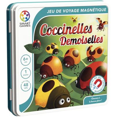 Coccinelles demoiselles. Contenu : 1 boîte de jeu métallique qui sert aussi pour le rangement, 12 coccinelles aimantées (5 rouges, 4 oranges, 3 jaunes), 1 livret de 48 défis avec leur solution. But du jeu : jeu magnétique de déduction dans lequel vous devrez trouver où poser vos coccinelles sur les feuilles de l’arbre. L’ordre prescrit tient compte de la couleur des trois familles et des valeurs numériques de chaque coccinelle représentée par le nombre de points sur leur dos. Intérêt pédagogique : Concentration, Logique, Planification, Résolution de Problèmes, Perception Visuelle 1 joueur A partir de 6 ans