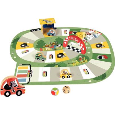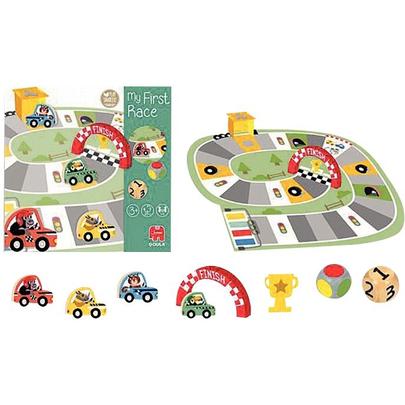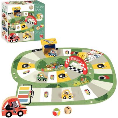 Ma première course. Contenu : 1 plateau puzzle de 9 pièces en carton épais, 4 voitures, 1 arche arrivée, 1 dé numéroté et 1 dé de feux de circulation. But du jeu : franchir sa voiture le premier la ligne d’arrivée en se déplaçant sur le plateau et en évitant toute les embuches comme les feux, la crevaison, un tunnel ou un accident. Intérêt pédagogique : Jeu compétitif avec apprentissage du calcul A partir de 3 ans De 2 à 4 joueurs Durée de la partie : environ 10 minutes