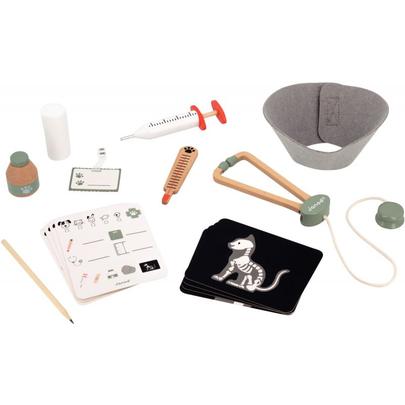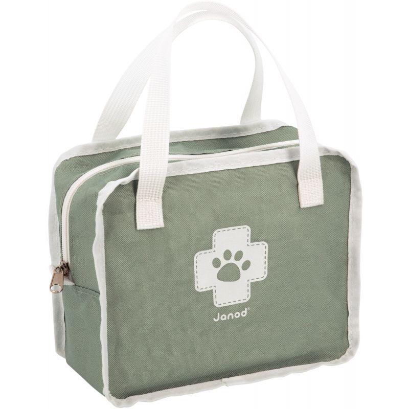 Mallette du vétérinaire + 16 accessoires. Mallette en tissu zippée avec 2 poignées de transport et 16 accessoires multi-matières : 1 stéthoscope, 1 seringue (L.16 cm), 1 thermomètre et 1 pot de crème en bois, 4 radiographies et 4 ordonnances recto/verso en carton épais à compléter avec 1 crayon de bois, 1 badge, 1 bande de tissu et 1 collerette en feutrine. Panoplie complète pour garder ses animaux en peluche en bonne santé ! Jouet d'imitation qui développe le vocabulaire, l'empathie et l'imagination des enfants. Livrée sans peluche. Dimensions de la mallette : L.22 x l.10 x H.17 cm. Dès 3 ans.