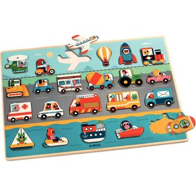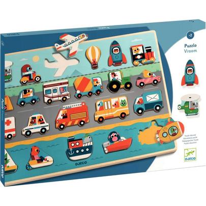 Puzzlo Vroom. Contenu : 1 grand plateau et 22 pièces en bois. Après avoir observé l'illustration, l’enfant s'amuse à replacer les véhicules selon leur lieu de conduite et leur silhouette. Contour des pièces auto correctif : un seul emplacement possible. Développe la concentration, la motricité fine et le vocabulaire des enfants. Dimensions du plateau : L.42 x l.30 x ép.0,8 cm. Dès 2 ans.