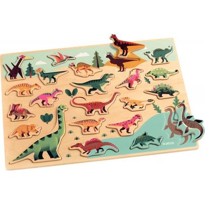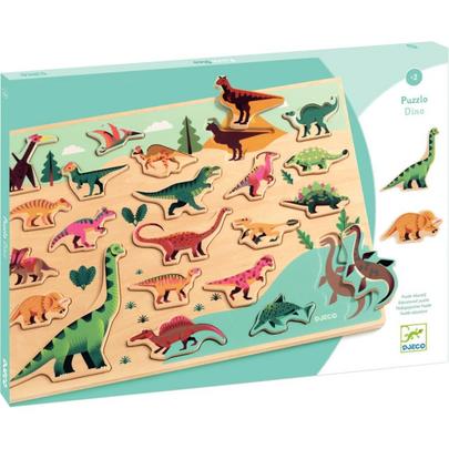 Puzzlo Dino. Contenu : 1 grand plateau et 22 pièces en bois. Après avoir observé l'illustration, l’enfant s'amuse à replacer les dinosaures selon leur silhouette. Contour des pièces auto correctif : un seul emplacement possible. Développe la concentration, la motricité fine et le vocabulaire des enfants. Dimensions du plateau : L.42 x l.30 x ép.0,8 cm. Dès 2 ans.