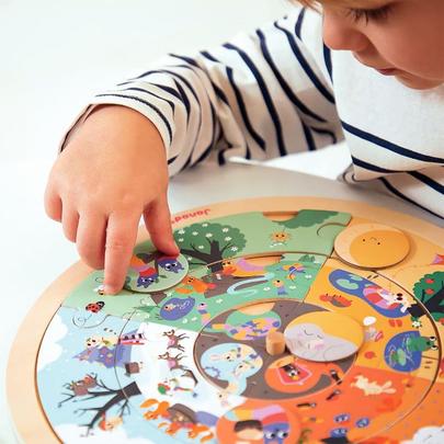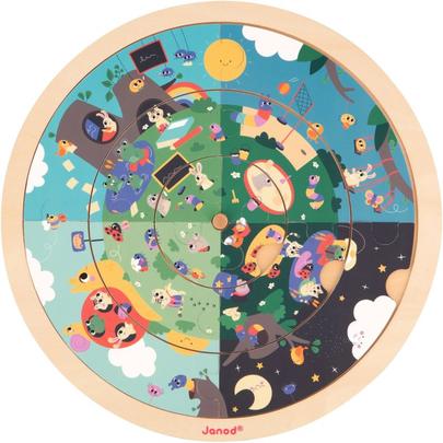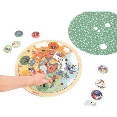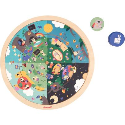 Puzzle d'observation rond recto/verso, le jardin. 2 en 1 : puzzle d’observation et jeu d’association. Contenu : 1 plateau rond contenant un puzzle de 12 pièces en bois, 20 cartes et 1 planche cache-cache en carton épais. Pièces illustrées au recto et au verso. Pour découvrir le cycle des saisons sur une face et le déroulement de la journée sur l’autre face. Le but du jeu est de reconstituer l'un des deux puzzles et de faire tourner les cercles pour faire correspondre les thématiques. Le jeu se poursuit sous forme de "Cherche et trouve". L'enfant place la planche cache-cache sur le puzzle, la tourne à l’aide d’une petite poignée (située sur le plateau) et doit retrouver les 10 éléments cachés sur chaque puzzle idéal pour développer l’acuité visuelle. Un jeu pédagogique qui permet de développer la concentration, le sens de l’observation. Diamètre du plateau : 27 cm. Dès 4 ans.