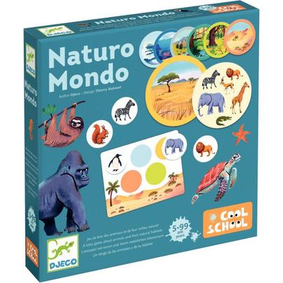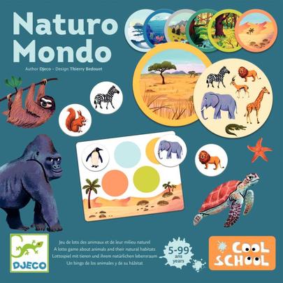 Naturo mondo. Contenu : 6 planches de loto en carton épais, 42 jetons, 7 cartes milieu naturel, 1 règle du jeu. But du jeu : Loto sur le thème des animaux et leur milieu naturel. Les enfants associent les animaux à leur milieu naturel. Le gagnant est le 1er à avoir complété sa planche. Intérêt pédagogique : Enrichissement du vocabulaire.