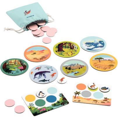 Naturo mondo. Contenu : 6 planches de loto en carton épais, 42 jetons, 7 cartes milieu naturel, 1 règle du jeu. But du jeu : Loto sur le thème des animaux et leur milieu naturel. Les enfants associent les animaux à leur milieu naturel. Le gagnant est le 1er à avoir complété sa planche. Intérêt pédagogique : Enrichissement du vocabulaire. A partir de 5 ans |