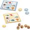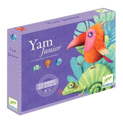 Yam's junior. Contenu : 4 cartes en carton épais, 28 jetons, 5 dés en bois, 1 règle du jeu. But du jeu : L’enfant qui remplit une ligne avec 3 jetons ou fait un Yam’s (5 animaux identiques) gagne la partie. A partir de 4 ans.