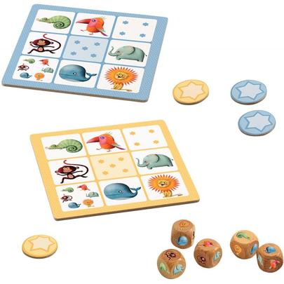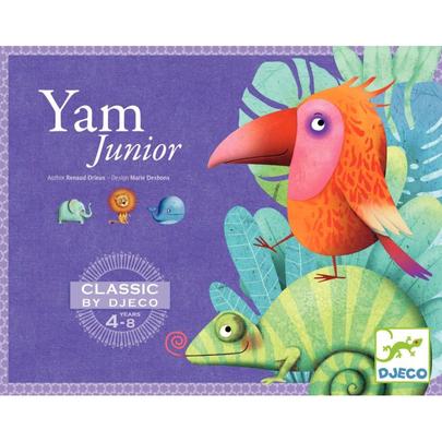 Yam's junior. Contenu : 4 cartes en carton épais, 28 jetons, 5 dés en bois, 1 règle du jeu. But du jeu : L’enfant qui remplit une ligne avec 3 jetons ou fait un Yam’s (5 animaux identiques) gagne la partie. A partir de 4 ans. |