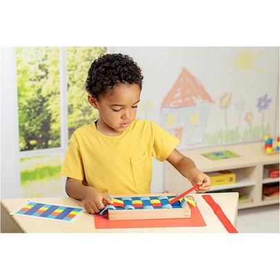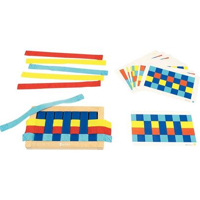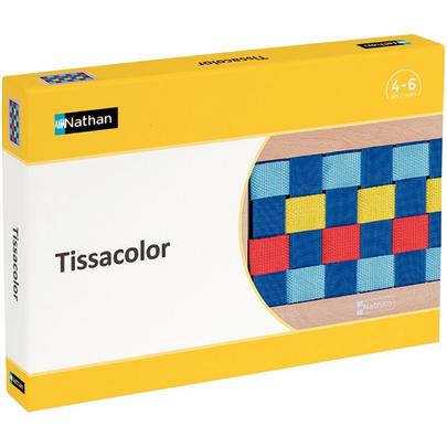 Tissacolor. Ce jeu original propose des activités de motricité fine et de décodage-codage de fiches. Développe la mobilité du poignet, la dextérité des doigts et prépare aux gestes d'écriture. Contenu : 1 livret pédagogique, 12 fiches recto verso soit 24 activités, 1 cadre en bois avec 7 bandes élastiques fixes (bleu marine), 9 bandes de tissu (L.29,5 x l.2,5 cm) de 3 couleurs (rouge, bleu, jaune). Dimensions du cadre : L.24,3 x l.14,5 x ép.2,5 cm. Dès 4 ans.