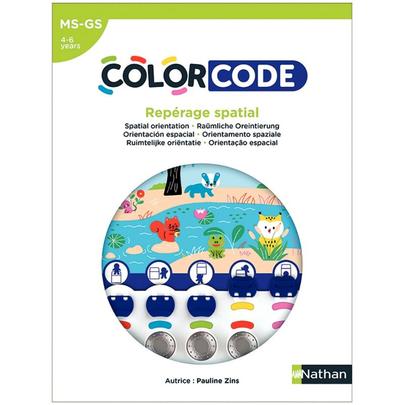 COLORCODE repérage spatial. COLORCODE est un nouveau principe de jeu auto correctif pour travailler à son rythme avec une tablette au design unique pour créer un effet de surprise ! Les activités fonctionnent toutes avec un code couleur pour la réponse de l’élève et la solution, ce qui rend COLORCODE très simple d’utilisation et accessible aux plus petits. A chaque nouvelle activité, il faut trouver la combinaison de couleurs gagnante, comme pour l’ouverture d’un coffre-fort ! À utiliser avec les supports COLORCODE vendus séparément. Niveaux : MS-GS. COLORCODE repérage spatial consiste à repérer les 5 mêmes animaux dans un environnement naturel et identifier la position spatiale de chacun : sur, sous, à côté, entre, devant, derrière, dans. La pochette contient 1 livret pédagogique et 12 fiches cartonnées 19,8 x 26,5 cm. Dès 4 ans.