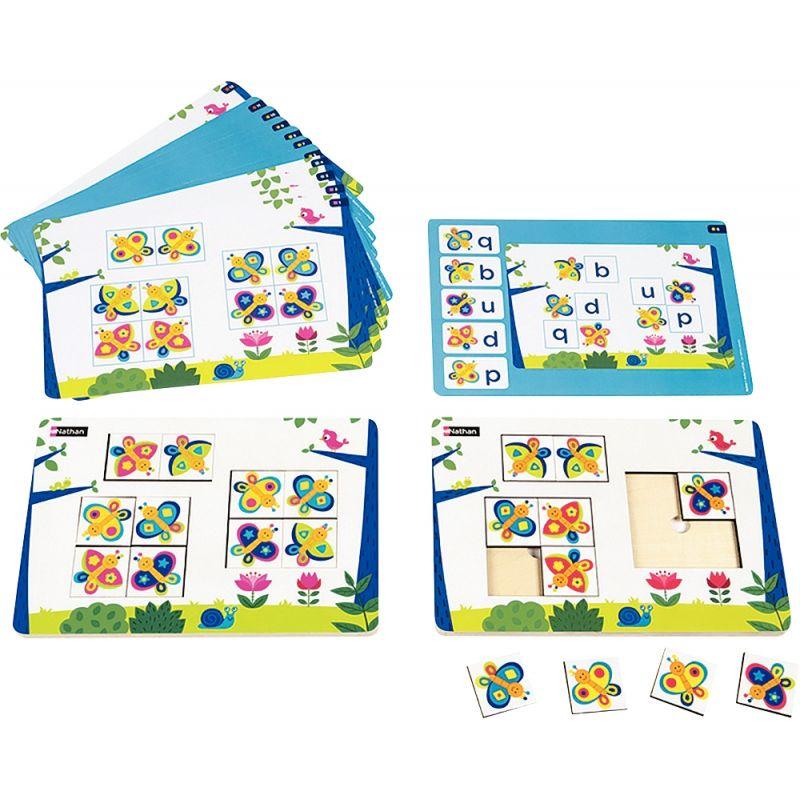 Atelier LudiTab, lettres miroirs. Cet atelier propose 2 puzzles à solutions multiples. Accompagnés de fiches d'activités, pour développer la discrimination visuelle fine et entrainer à la reconnaissance de lettres ou de groupes de lettres visuellement proches. Niveau : GS. Atelier pour 2 enfants. Contenu : 1 livret pédagogique, 12 fiches d'activités recto verso soit 24 modèles, 2 puzzles identiques comprenant chacun 10 pièces et 1 socle en bois verni (L.26 x l.18 x ép.1 cm). Dès 5 ans.