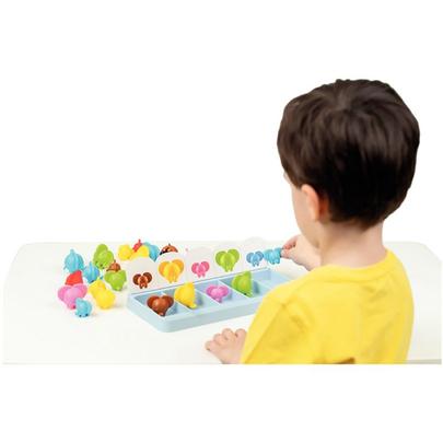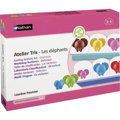 Atelier Tris - Les éléphants. L'enfant décode la consigne de la fiche d'activités et place, dans chaque case de sa boîte de tri, l'éléphant qui convient (taille et couleur). Par l'observation et la manipulation, il apprend à identifier les caractéristiques d'un objet et à établir une correspondance terme à terme. Les éléphants représentés sur les fiches sont de la même taille que les figurines pour faciliter la perception visuelle et les comparaisons. La boîte contient : 1 livret pédagogique 36 fiches d'activités 45 figurines éléphants en plastique de 3 tailles (H : 2,7 / 3,3 / 3,8 cm) et dans 6 couleurs (rouge, vert, bleu, jaune, rose, marron) 2 boîtes de tri en plastique. Les fiches d'activités sont organisées en 6 séries de 6 fiches de difficulté progressive. Permet d'exercer les capacités de discrimination visuelle de savoir reconnaître et nommer 6 couleurs de maîtriser le critère de la taille (petit, moyen, grand) de classer ou ranger des objets selon plusieurs critères (ici la couleur et la taille). Dès 3 ans.