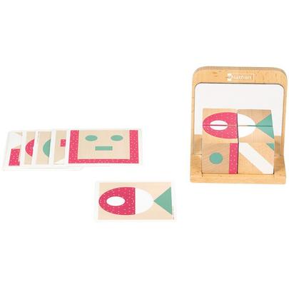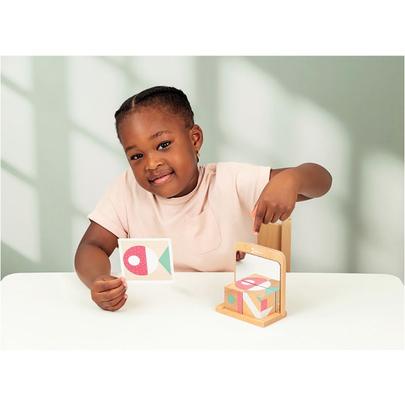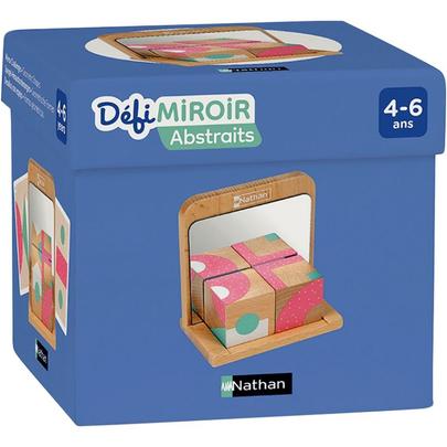 Défimiroir abstraits. Qui relèvera le défi du miroir ? Un jeu de découverte et de manipulation très amusant pour développer l'observation, la logique, le repérage dans l'espace et la résolution de problèmes. L'enfant reproduit le modèle de la fiche en positionnant les 2 cubes devant le miroir. Ce travail de recherche l'amène à faire des hypothèses, à les mettre en œuvre par essais-ajustements et à résoudre le problème. Il découvre le phénomène d'inversion dans un miroir et la symétrie axiale. Contenu : 12 fiches recto verso soit 24 défis, 2 cubes en bois dont chacune des 6 faces est différente (côté 4 cm), 1 support en bois avec 1 miroir (L.10,8 x l.6,5 x H.11,8 cm). Dès 4 ans.