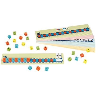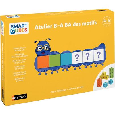 Atelier B-A BA des motifs. Pour 2 enfants. Cet atelier propose des activités variées autour des motifs afin de renforcer les compétences mathématiques. Les enfants construisent les motifs présentés sur les fiches avec les cubes. Ils repèrent le motif de base et peuvent s’autocorriger, en autonomie. L’atelier permet de travailler les motifs répétitifs (séries verte, rose, bleue) et évolutifs (série jaune). 24 fiches recto verso (soit 48 activités) organisées en 4 séries de 6 fiches de difficulté progressive. Le recto de chaque fiche sert de correction à l’activité du verso. Au recto : reproduction terme à terme. Au verso : 3 types de situations-problèmes à résoudre. L’enfant peut valider sa réponse par simple superposition sur la fiche. La boîte contient : 24 fiches recto verso soit 48 activités (format déplié 43 x 9 cm), 120 SmartCubes en plastique de 4 couleurs (2 x 2 x 2,2 cm), 1 livret pédagogique. Dès 4 ans.