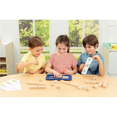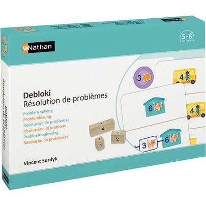 Atelier Debloki. Debloki - Résolution de problèmes est conçu pour aider les élèves à résoudre des problèmes arithmétiques en leur faisant manipuler matériellement les nombres des énoncés. Ils comprennent les interactions entre les nombres et progressent vers l’abstraction. L’enseignant ou l’enfant lit de haut en bas, étape par étape, l’énoncé du problème illustré sur la fiche. L’enfant place les blocs des nombres en jeu dans le plateau, puis il lit la réponse sur la droite numérique. La chronologie des énoncés, la manipulation de la valeur cardinale des nombres et la verbalisation des procédures sont au cœur de la démarche de recherche. Le matériel offre différentes modalités de travail : en groupes de 6 à 8 élèves, en petits groupes collaboratifs, en individuel. 40 fiches d’activités organisées en 8 séries de 5 fiches. Chaque série propose un type de problèmes : composition de deux collections, ajout, retrait, produit, partage. La boîte contient : 40 fiches d’activités recto verso (20 x 13 cm), 27 blocs nombres en bois (L/l/H : 2 à 20 x 2 x 2 cm), 1 plateau en bois rainuré comprenant 2 lignes numériques (27 x 16 cm), 1 livret pédagogique. Dès 5 ans.