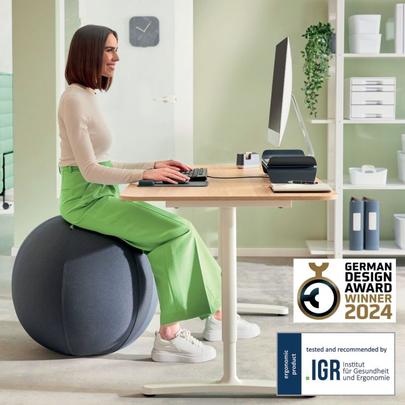 Ballon d'assise anti-basculement gris foncé. Le ballon d'assise Leitz anti-basculement permet d'avoir une position assise mobile afin de solliciter les muscles du dos et de la ceinture abdominale. Il est recommandé dans la journée de travail de varier les positions pour mobiliser les muscles concernés. Avec un diamètre de 65 cm, ce ballon d’assise est idéal pour les personnes mesurant entre 156 et 180 cm. Il peut supporter un poids maximal de 150 kg. La fonction d'arrêt de sécurité empêche le ballon de rouler lorsqu'il est debout et permet de le ranger facilement. Pour une utilisation optimale, alternez toutes les 30 minutes entre le ballon et une chaise et veillez à ce que le gonflage soit correct. Dispositif de sécurité anti-basculement certifié par TÜV. Conformément à la norme DIN 26800 EN ISO 1553, ce ballon a été testé et recommandé par l'Institut allemand IGR. La housse en tissu du ballon est amovible et lavable à la main. Inclus un ballon d’assise, une housse en tissu, une pompe à air manuelle, deux bouchons, un extracteur de bouchons et une feuille d'instructions. Dimensions 65 x 65 x 65 cm. Garantie 2 ans.
