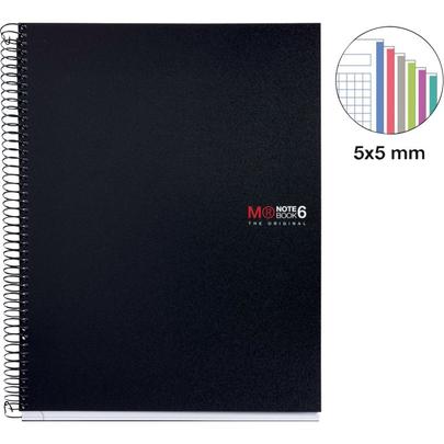 NOTEBOOK MIQUELRIUS format A4, 150 feuilles 70g, quadrillé 5x5, couverture PP noir. Cahier à reliure intégrale NOTEBOOK 6 collection THE ORIGINAL. Couverture en polypropylène opaque noir 8/10ème, souple et résistant à l'usure. Papier blanc extra opaque 70g. 300 pages microperforées détachables et perforées. Réglure, en-tête et bords de 6 couleurs assorties.