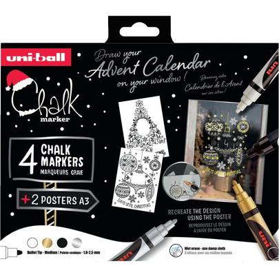 Coffret de 4 marqueurs Chalk Scandinave. Coffret de 4 marqueurs craie uni-CHALK MARKER pointe conique moyenne PWE5M,marqueur idéal pour la décoration des vitres en période de Noël. Marqueur craie qui résiste à la pluie. Un seul marqueur intérieur / extérieur. S'efface avec un chiffon humide. Pointe ogive moyenne 1,8 - 2,5 mm. Coffret comprenant : 1 blanc, 1 argent, 1 or, 1 noir + 2 posters format A3